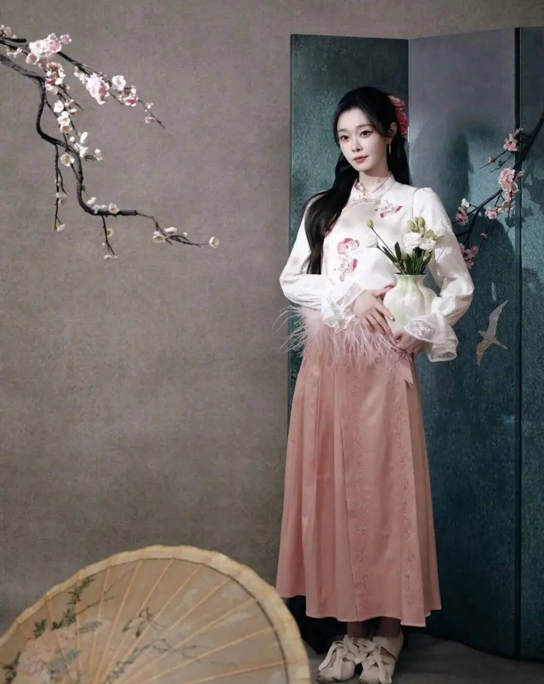 我尤其喜爱她那套粉色小马套头衫搭配改良马面裙的造型,显得温柔又俏皮,少女感十足,美好极了。